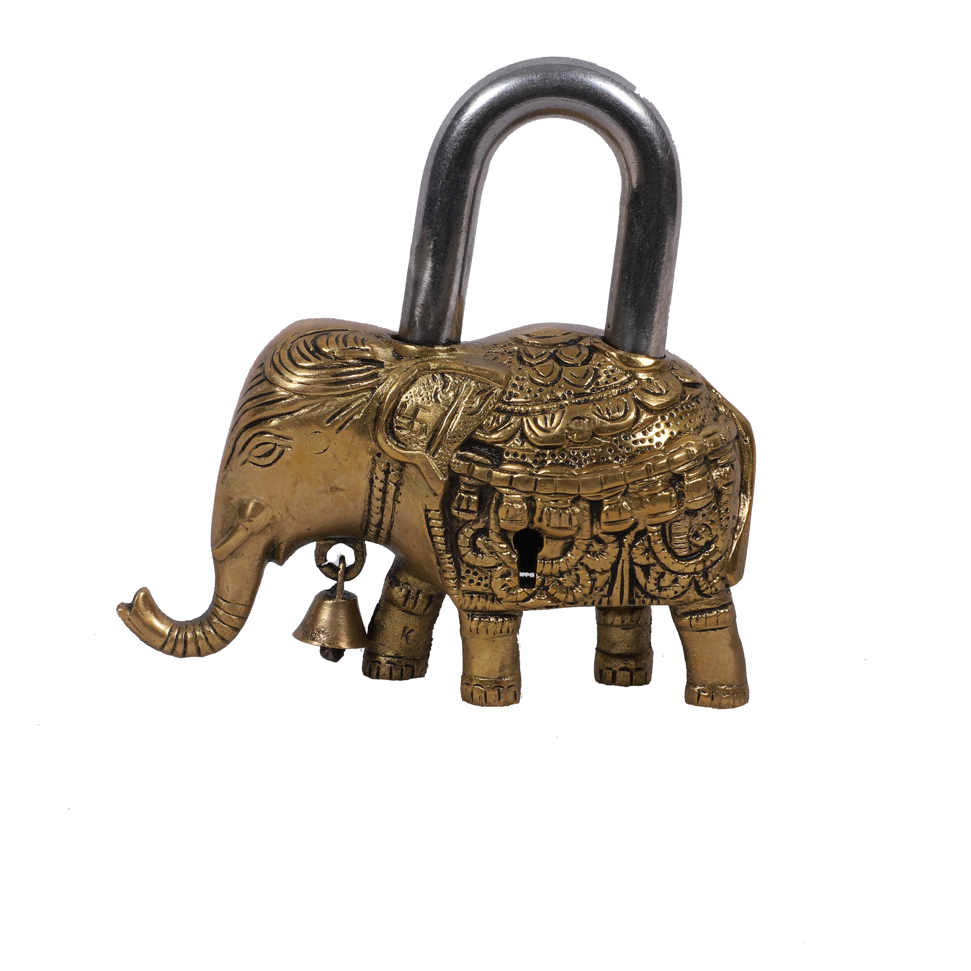Antique Brass Padlock with Elephant Design: Desiadda presents a fully functional padlock that evokes the grandeur of royal brass locks on ancient, mysterious doors. This exquisite lock, carved in the form of an elephant, symbolizes toughness, weight, and unwavering strength. The intricate brass work showcases the complexity of traditional Indian craftsmanship. The lock comes with two keys and lends an ancient, rich appearance to your doors, enhancing the security of your home, office, or shop while adding a touch of positive energy to your surroundings. Use it to secure your trunks, cupboards, and windows while displaying its unique ethnic beauty and charm.