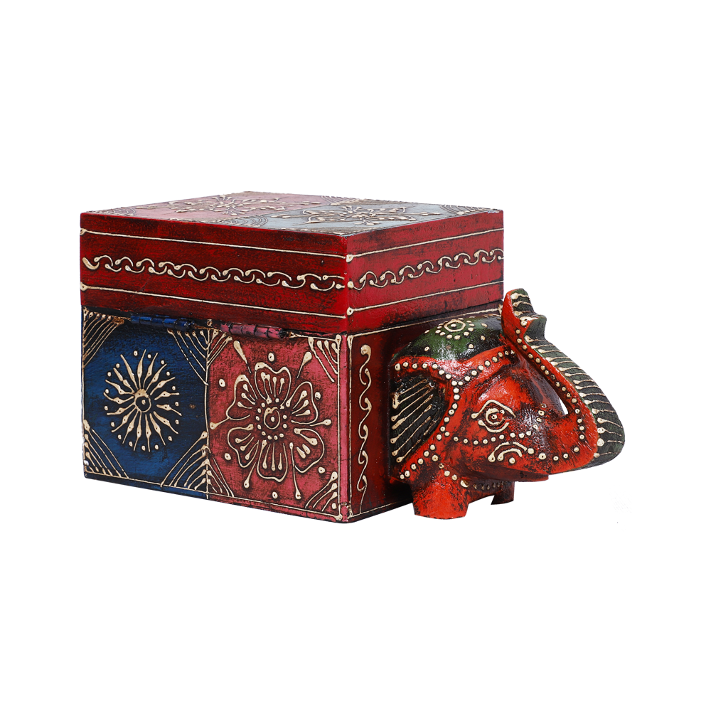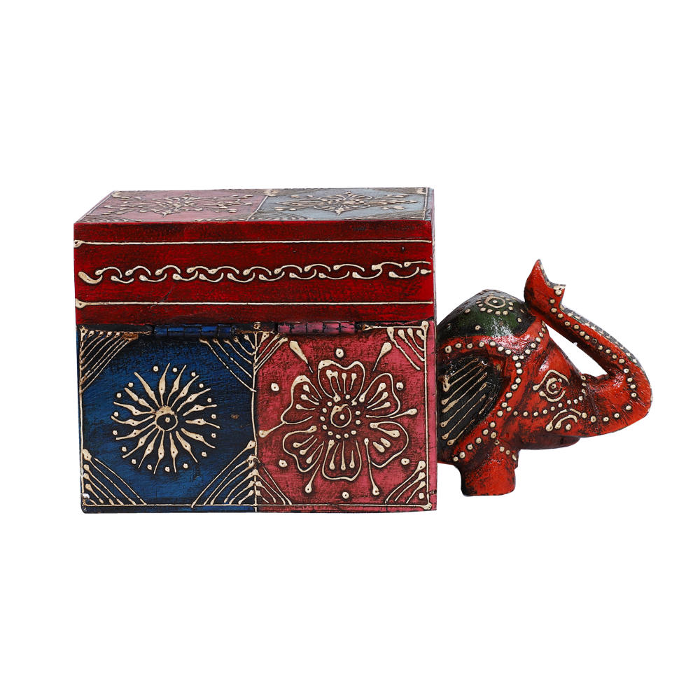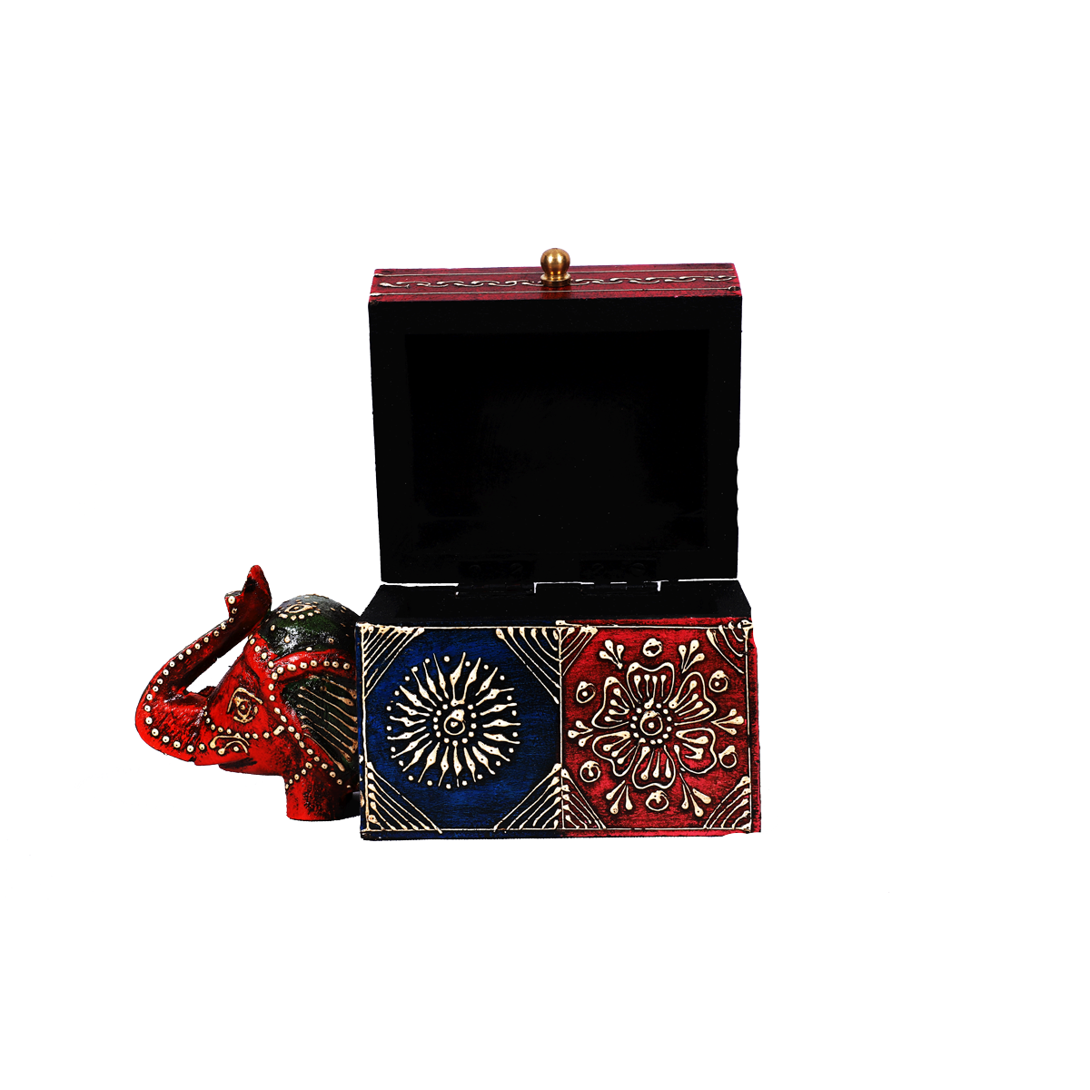 Crafted with care, this exquisite wooden jewelry box features a trunk-up elephant motif, symbolizing prosperity and abundance. It serves as a secure repository for your valuable possessions, including gold, watches, and family heirlooms. Place it on your dressing table to organize small fashion accessories, cosmetics, and perfumes, elevating the elegance of your personal spaces. Additionally, this versatile piece can function as a charming centerpiece on any table, adding a touch of sophistication to your decor. Ideal for any occasion, these jewelry boxes make delightful gifts for ladies and girls, combining practicality with timeless beauty.
