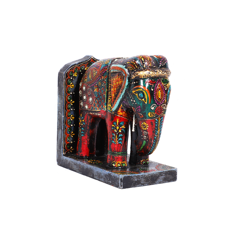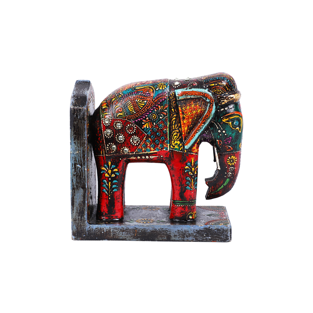 An exclusively crafted 'Trunk-up' wooden elephant book stand, featuring royal heritage designs. Perfect for study rooms or office tables, this decorative bookend adds elegance and cultural significance to your book collection. Ideal for any décor style.