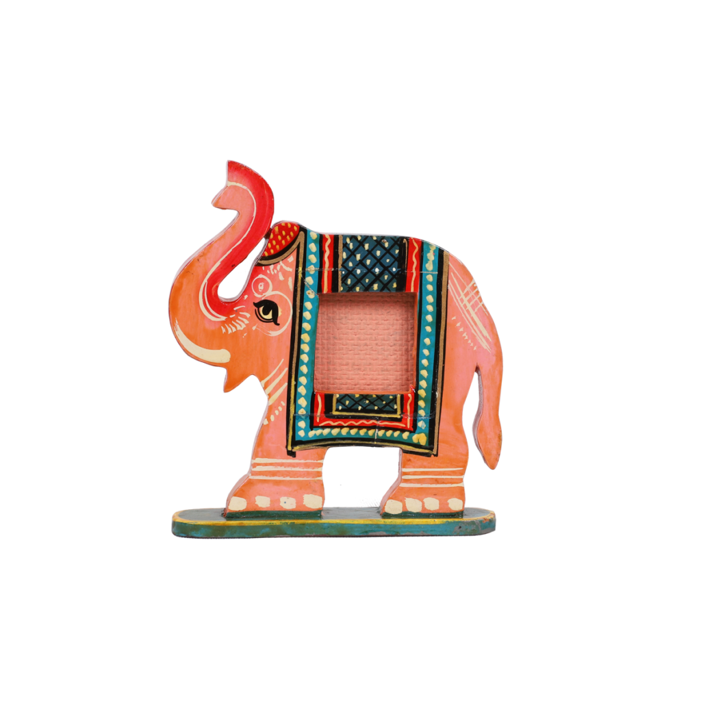 Crafted from tulipwood, this elephant-shaped photo frame exudes elegance and charm. Handcrafted with precision, it features a sleek glass surface, perfect for showcasing your most cherished portraits. With its vibrant colors and distinctive design, this frame adds a modern and lively touch to any table or display area.