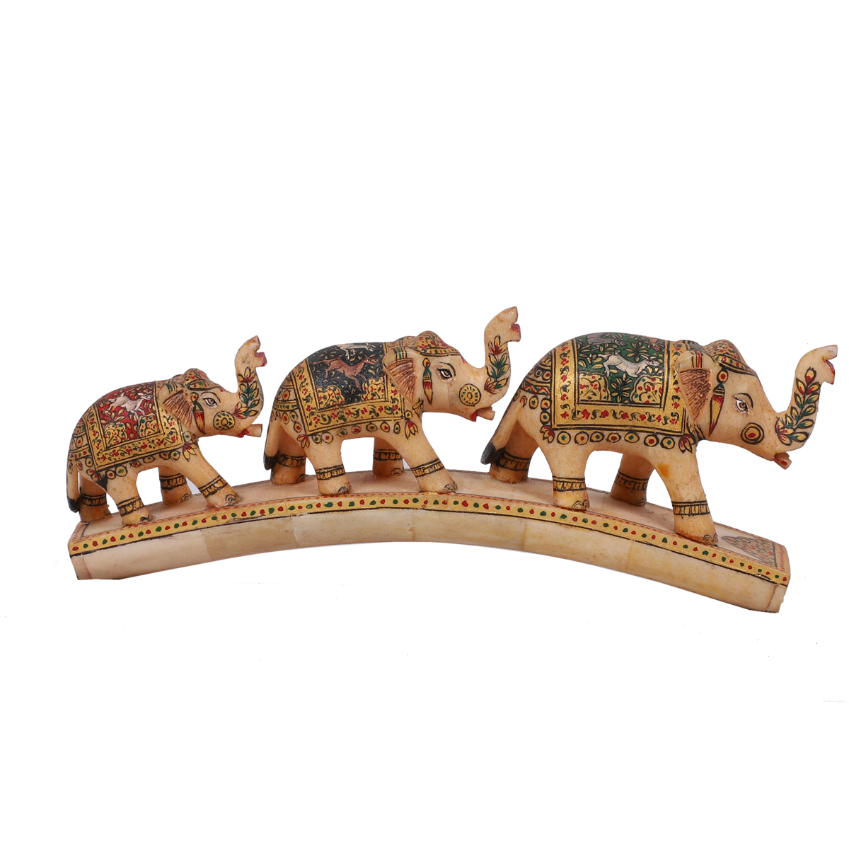 This Mughal miniature hand-painting on an intricately hand-carved camel bone elephant showpiece beautifully captures elephants on the move. Representing parental care, companionship, loyalty, and community, these affectionate and protective elephants are an excellent addition to your home's arts and crafts collection. Perfect for an entrance lobby or formal living space, this Mughal-inspired elephant artifact also makes a thoughtful and unique return gift.