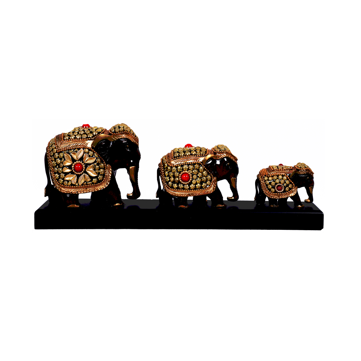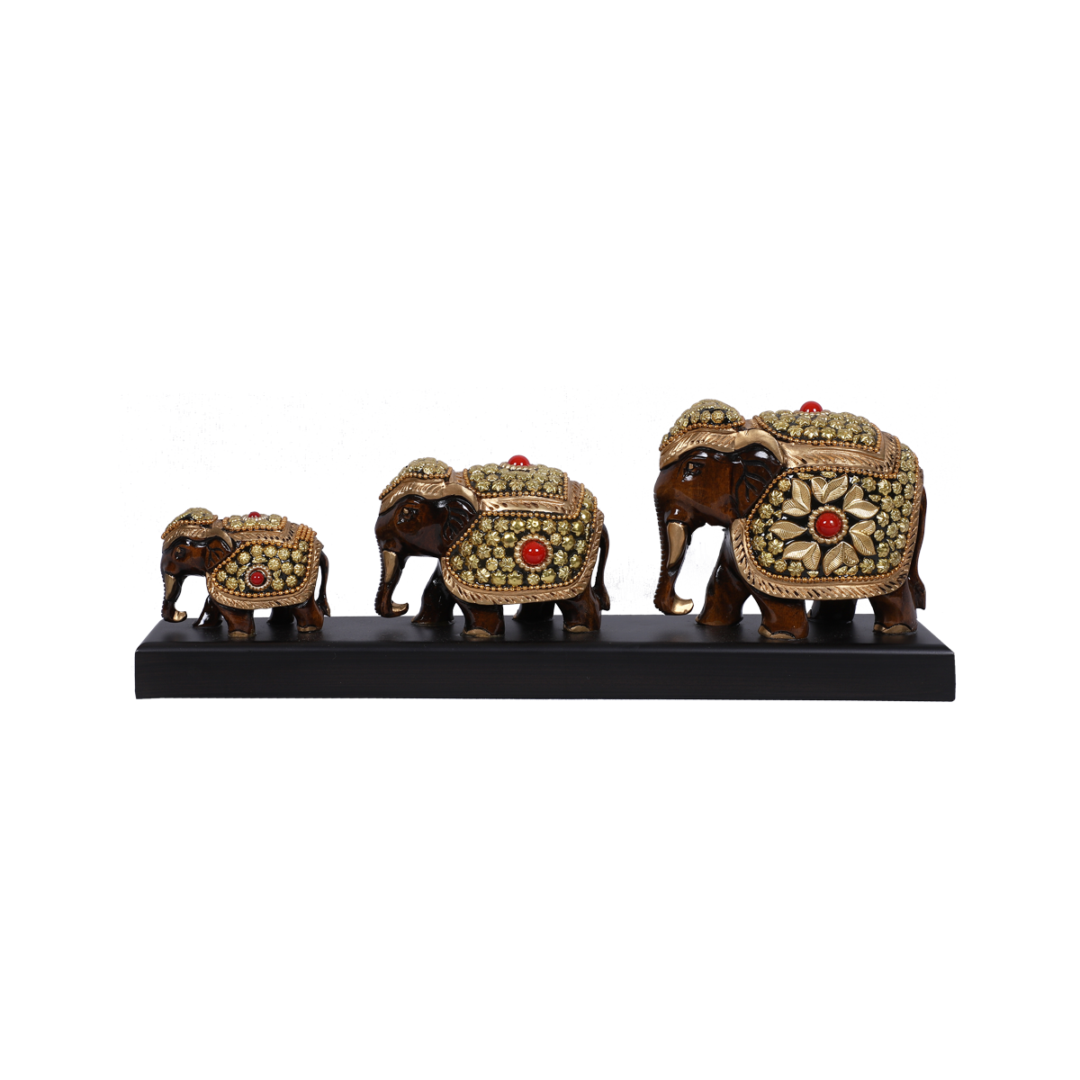 This magnificent wooden elephant is adorned with intricate golden jewelry work and brass inlay, reminiscent of royal elephants parading in a row. The exquisite detailing adds a touch of elegance and beauty to the elephant, much like how jewelry complements a woman's attire. This stunning piece makes for an excellent gift for women during traditional festivities or joyous celebrations, captivating them with its golden jewelry detailing. Symbolizing good fortune and luck, these elephants bring a sense of positivity and charm to any space.