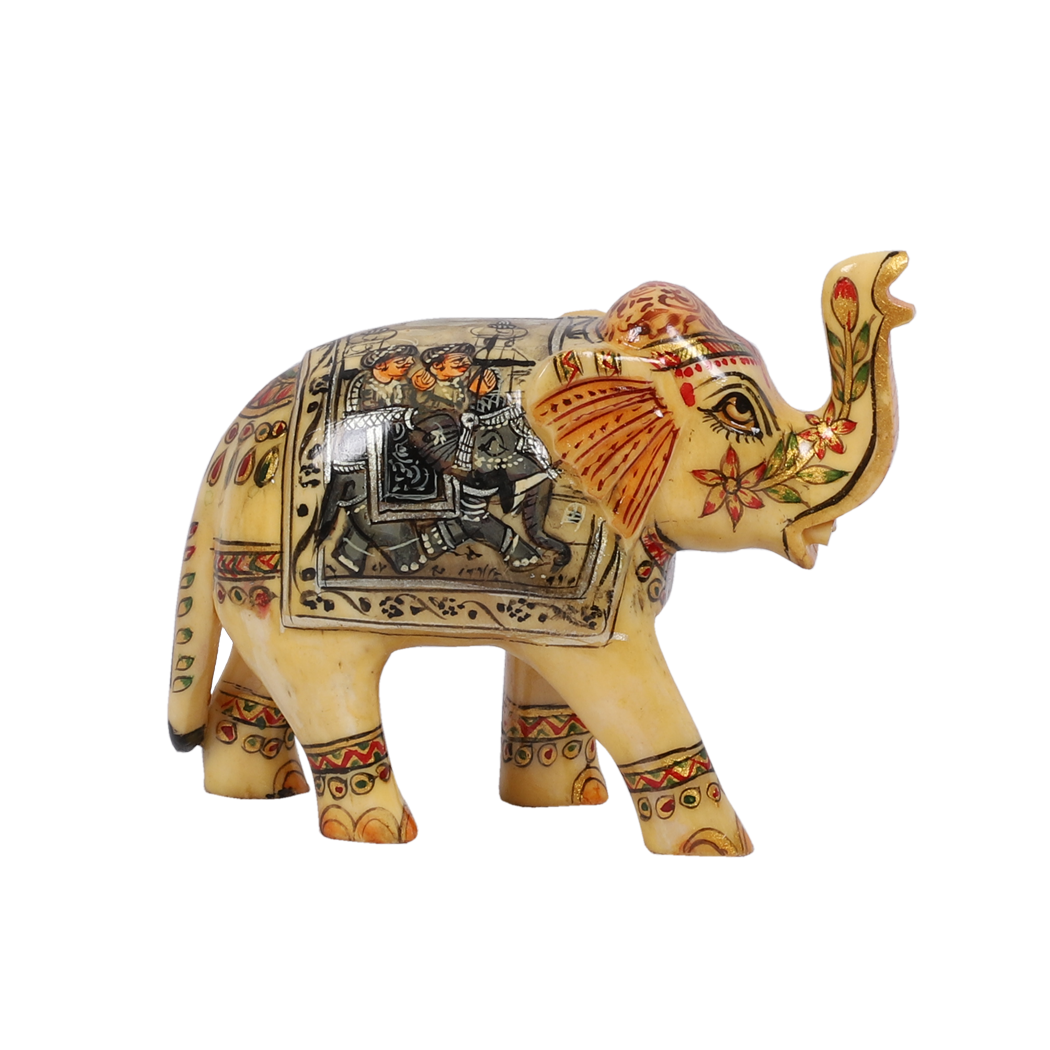 This intricately hand-carved camel bone elephant showpiece features exquisite Mughal miniature hand-painting, highlighting the majestic qualities of the elephant. Globally recognized as symbols of good luck, power, success, wisdom, and experience, these elephants bring positive energy wherever they are displayed. The stunning Mughal miniature painting adds a touch of royalty and novelty, drawing attention with its radiance and shine. This royal artifact is perfect for enhancing the decor of your home or as a thoughtful and elegant gift.