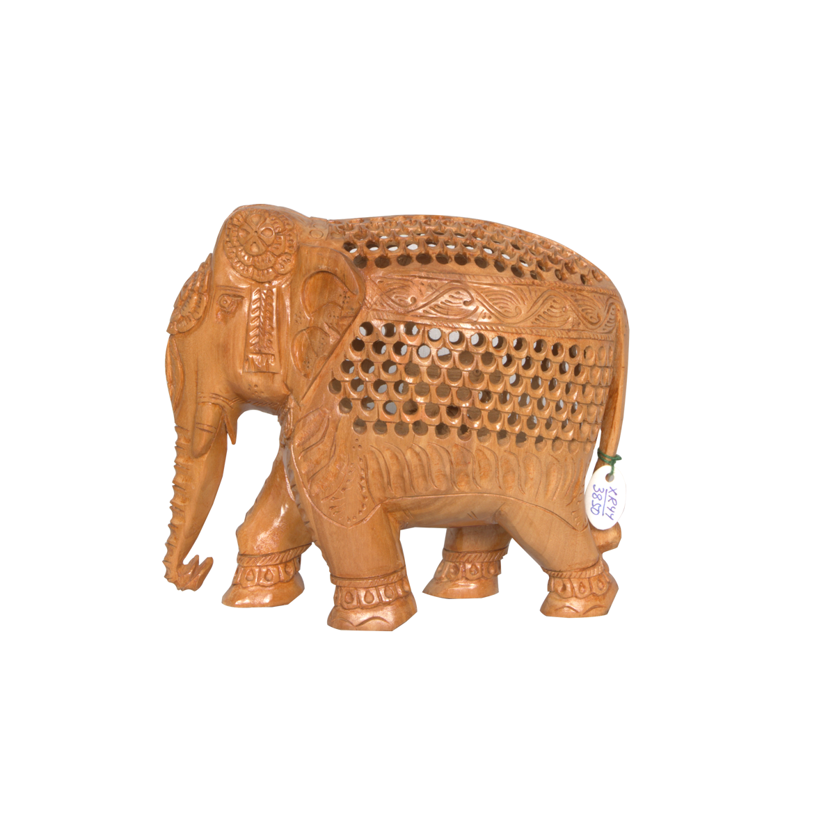 This jaali-designed undercut wood elephant display features a baby elephant inside, showcasing intricate hand-carved details with a trunk-down design and a sturdy base. Crafted from supreme quality wood using minimal tools such as mini-drills, mini-saws, and emery sheets, this piece is an ideal gift for housewarmings, birthdays, anniversaries, holiday parties, festivities, and religious celebrations. To maintain its charm, simply clean with a dry cloth to remove dust.