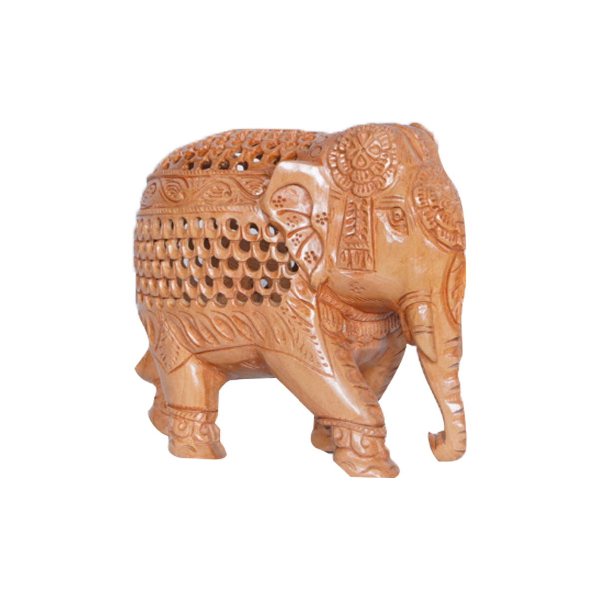 This jaali-designed undercut wood elephant display features a baby elephant placed inside and showcases fine hand-carved detailing. The wooden elephant, with its trunk down, is crafted by artisans using raw blocks of supreme quality wood and minimal tools such as mini-drills, mini-saws, and emery sheets. This exquisite piece makes an ideal gift for housewarmings, birthdays, anniversaries, holiday parties, festivities, and religious celebrations. To maintain its beauty, clean it with a dry cloth to remove dust.