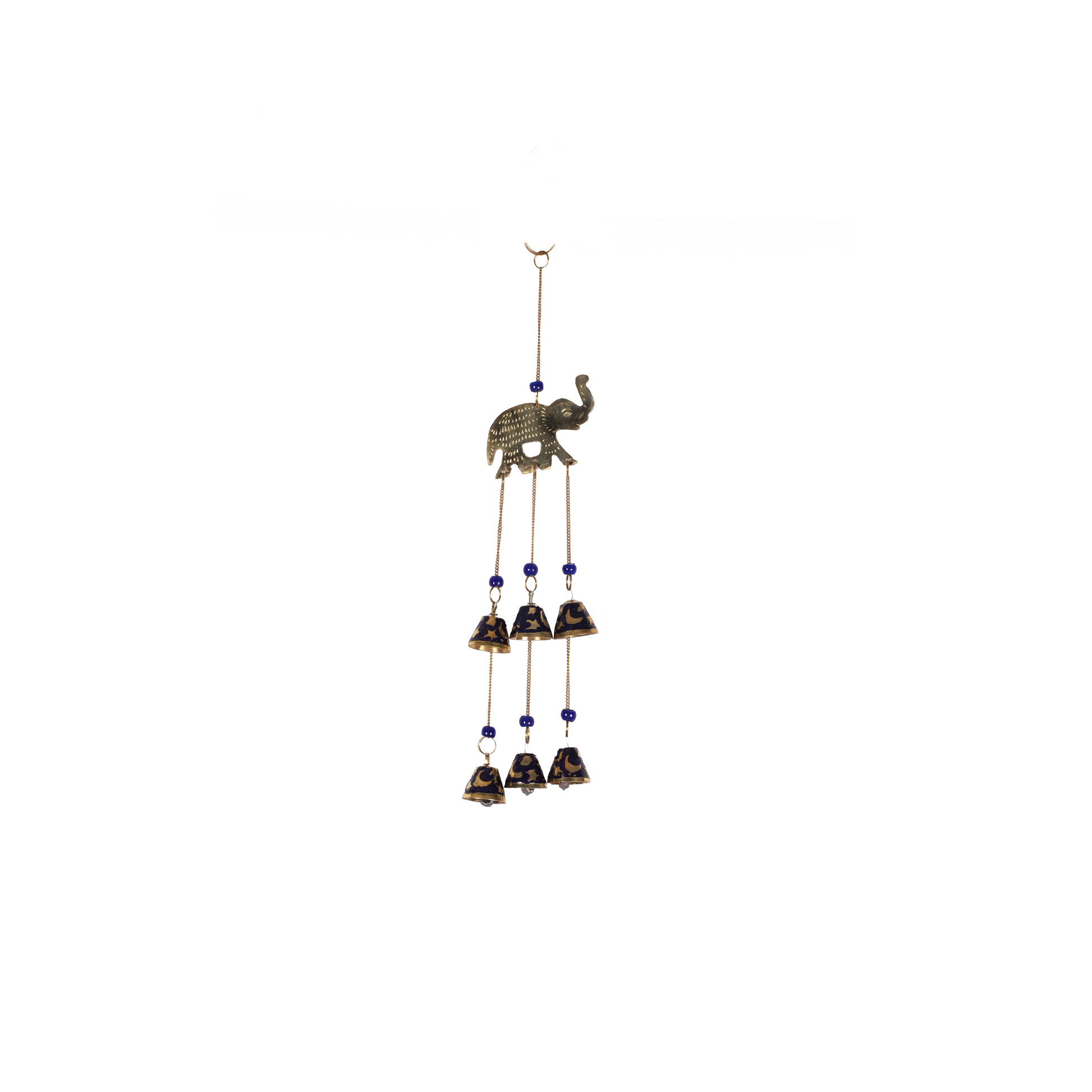 This beautifully crafted brass elephant wind chime features a single elephant adorned with intricate designs, complemented by blue beads. The elephant holds four hanging bells, each producing a soothing chime when moved by the breeze. The combination of brass and blue beads creates a visually appealing and tranquil decor piece. Ideal for hanging in a home, garden, or patio, this wind chime not only adds aesthetic charm but also symbolizes good luck and positive energy. Perfect as a unique gift or a serene addition to your space.