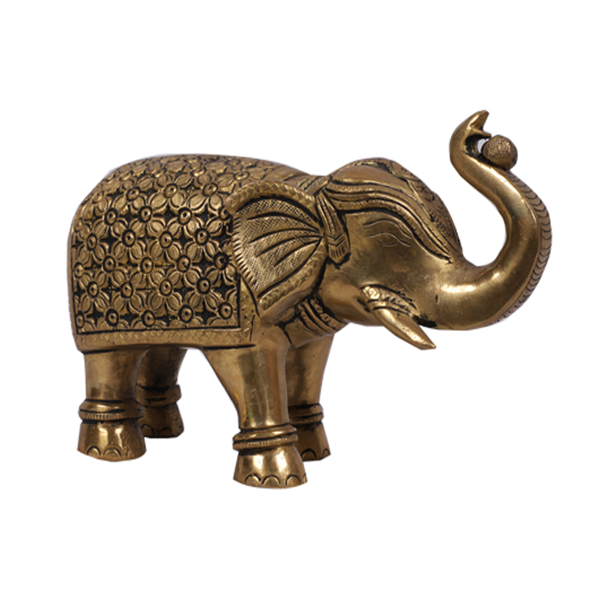 This magnificent brass elephant showpiece, with its trunk raised in an eating action, features intricate bell-flower carvings that lend it a traditional and natural appearance, enhancing your home's ambiance. Revered for their spiritual and symbolic significance, these trunk-up elephants are seen as sacred and god-like. This versatile elephant artwork serves both decorative and spiritual purposes, and placing it on your desk facing outward symbolizes intellectual leadership, composure under pressure, and caution.