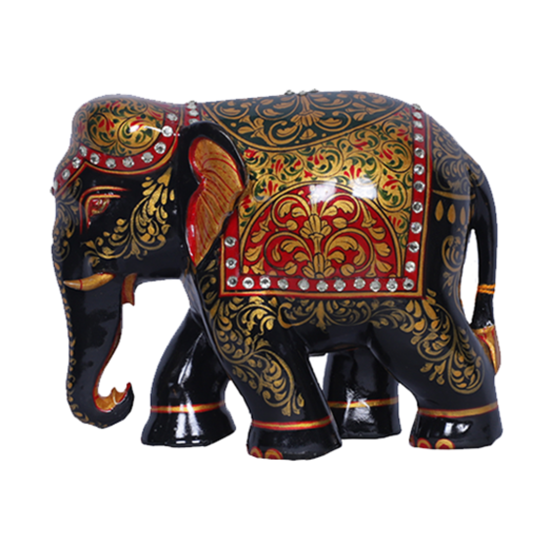 Crafted from dark teak wood, this painted trunk-down elephant exudes a majestic and calm presence reminiscent of a seasoned royal elephant. The intricate floral paintwork, skillfully executed by the sculptor, captivates the eye with its vibrant colors and detailed patterns. Adorned with vividly colorful floral paintings on the linen, the elephant exudes traditional authenticity and timeless elegance.With its rich and royal aura, this carved artifact adds a touch of sophistication to any space it inhabits. Whether displayed as a standalone piece or incorporated into a decorative ensemble, it serves as a testament to the exquisite craftsmanship and artistic talent of its creator.