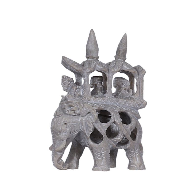 This marble soapstone elephant features a jaali design carving with a baby elephant nestled inside. Cut from a single piece of stone and hand-drilled, the design is influenced by the traditional Howdah. Recognized for their compassionate and altruistic nature, these elephants symbolize empathy and kindness. This exquisite piece of art adds elegance and cultural richness to any space, making it a perfect decorative addition or thoughtful gift.