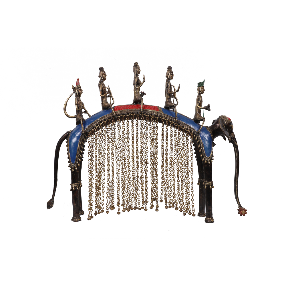 Introducing the exquisite Brass Ram Darbar with Elephant, a unique and imaginative masterpiece of metal artistry. This stunning piece combines the revered image of the divine quartet from the Ramayana seated atop a majestic elephant. The intricate detailing and craftsmanship are highlighted by a series of brass bell swing chains that produce soft, melodious chimes, adding to the divine ambiance. Perfect for inspiring aesthetic awe in your guests, this rare work of art is an exceptional choice for enhancing the meaning and value of any gift. Ideal for festivals, special occasions, or as a centerpiece in your home décor.