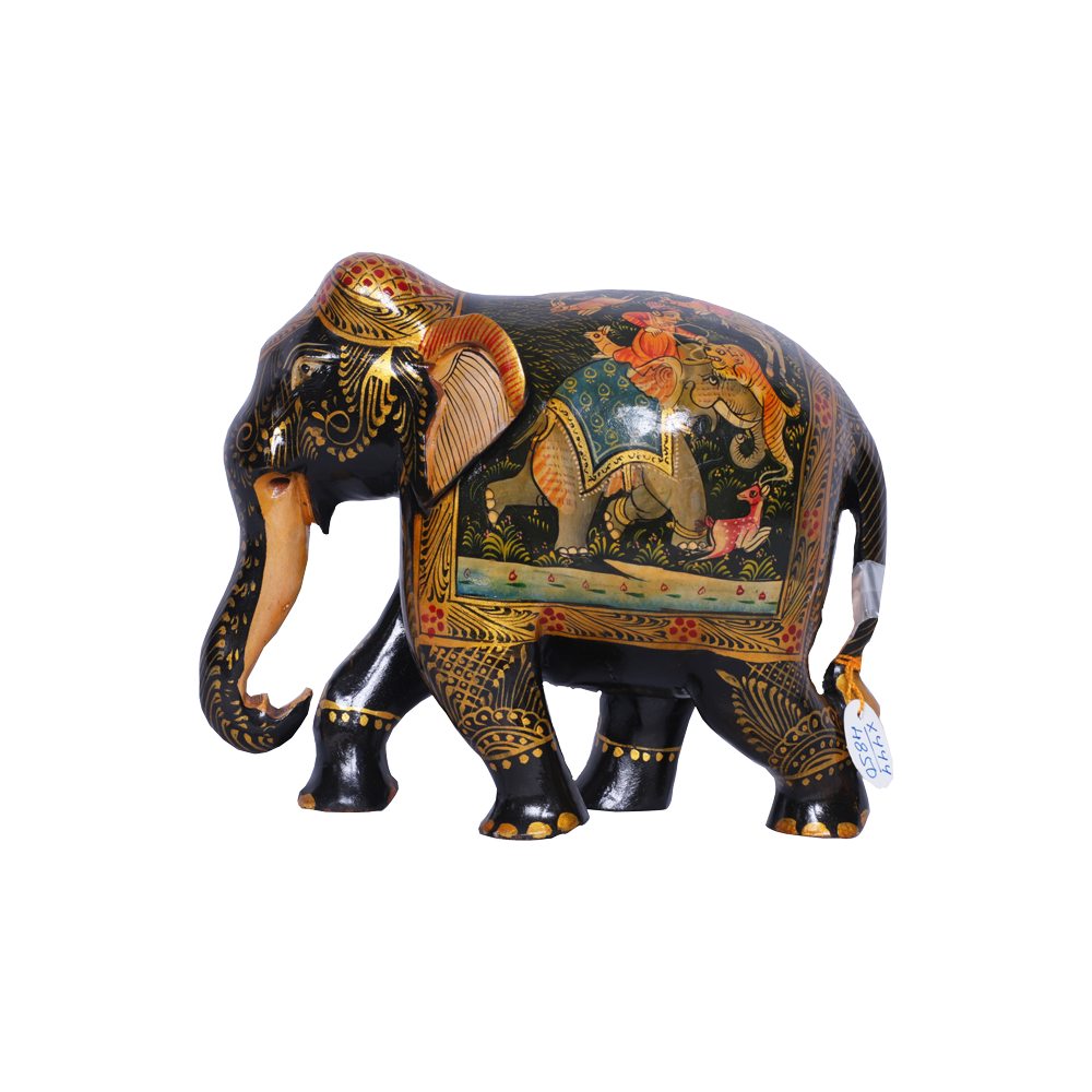 Crafted from dark teak wood, this exquisite sculpture depicts an elephant in a regal posture, with its trunk elegantly lowered. The masterful workmanship is evident in the lifelike depiction of the majestic creature, exuding an air of tranquility and dignity. Intricately painted with vibrant colors, the artwork on the linen draped over the elephant further enhances its traditional authenticity, showcasing the skill of the artisan. The meticulous attention to detail captivates the observer, from the subtle nuances of the elephant's form to the elaborate patterns adorning its body. As a testament to its artistry, this carved artifact imbues any space with a sense of opulence and refinement, evoking a rich and royal ambiance in its surroundings.