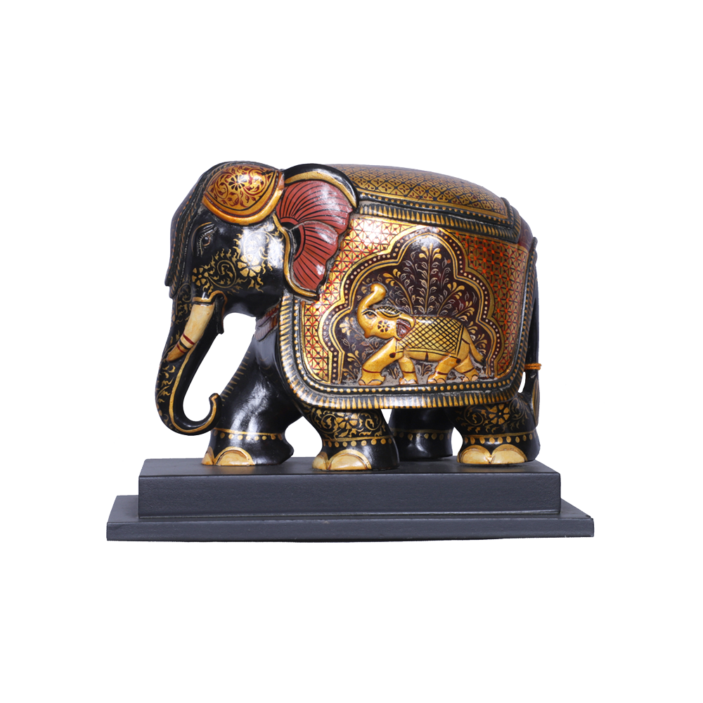 This painted elephant sculpture, carved from dark wood with a solid flat base, depicts the majestic and serene demeanor of a seasoned royal elephant, with its trunk gracefully lowered, showcasing the skill and artistry of the sculptor through eye-catching paintwork and meticulous attention to detail. Adorning the linen draped over the elephant is a vividly colorful painting of another elephant, adding traditional authenticity to this captivating artwork, which radiates a rich and royal aura, enriching its surroundings with regal elegance.