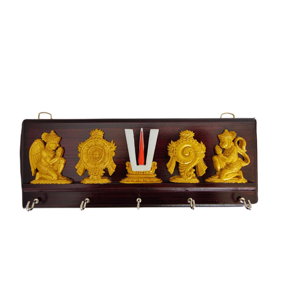 This intricately crafted wooden key hanger features sacred Vaishnavite symbols — Garuda, Shankha (conch), Chakra (discus), Namam, and Hanuman — all in a rich golden finish. A perfect fusion of devotion and utility, it adds a spiritual charm to your entryway or pooja space while keeping your keys organized.